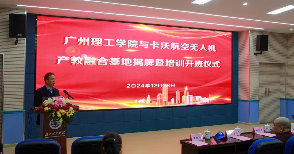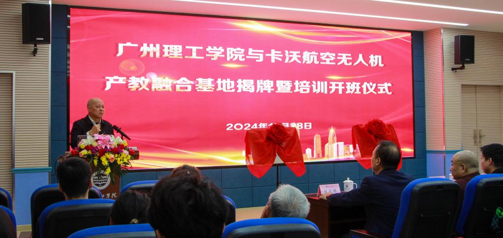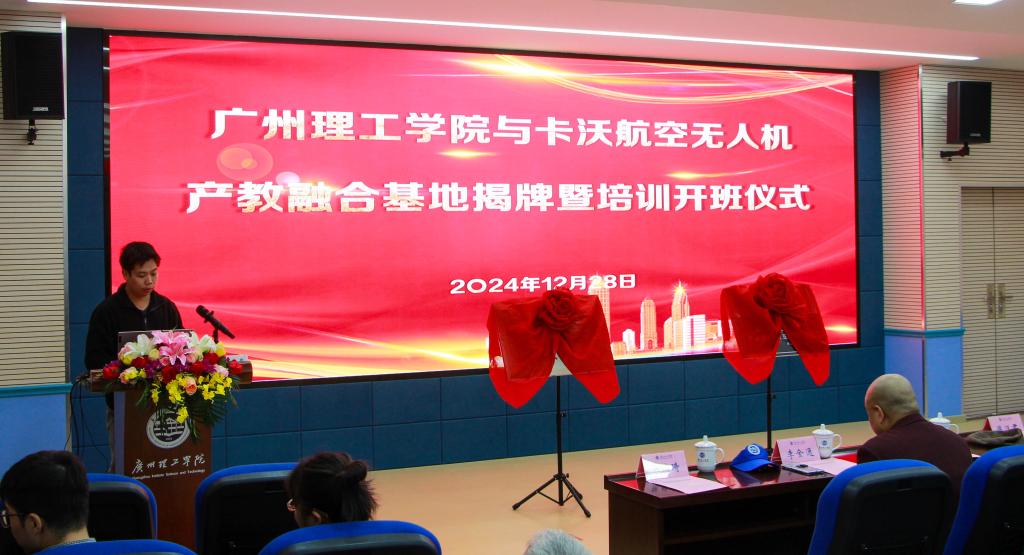12月28日,广州理工学院与广州卡沃航空服务有限公司携手共建的无人机产教融合基地揭牌暨培训开班仪式在惠州校区204报告厅举行。广州卡沃航空服务有限公司总经理杜冠杰,williamhill威廉希尔副校长陈汉君、产教融合部部长石凤喜、williamhill威廉希尔全体教职工及首批培训班学员参加了本次活动。