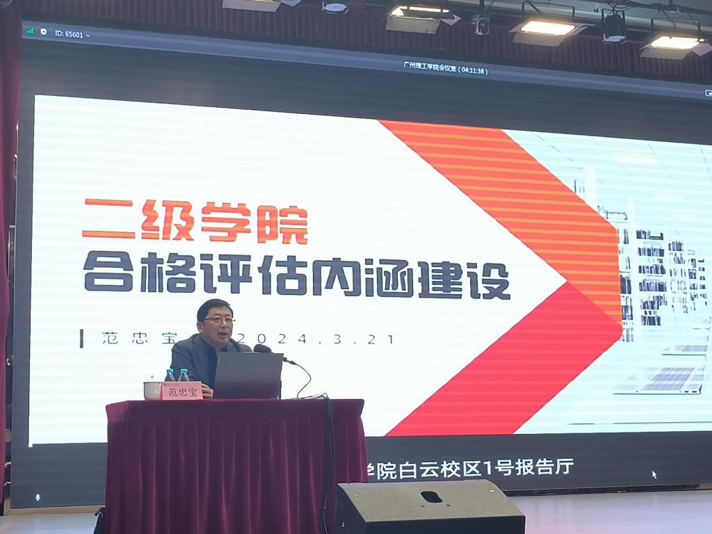 (李美颖)3月21日下午,教育部本科教学工作合格评估核心专家、广东省高校审核评估专家范忠宝教授应邀来校作题为“二级学院合格评估内涵建设”的专题讲座。学校领导、相关职能部门工作人员和各二级学院领导班子、系主任、专任教师参加了讲座,讲座由副校长张世梅主持。