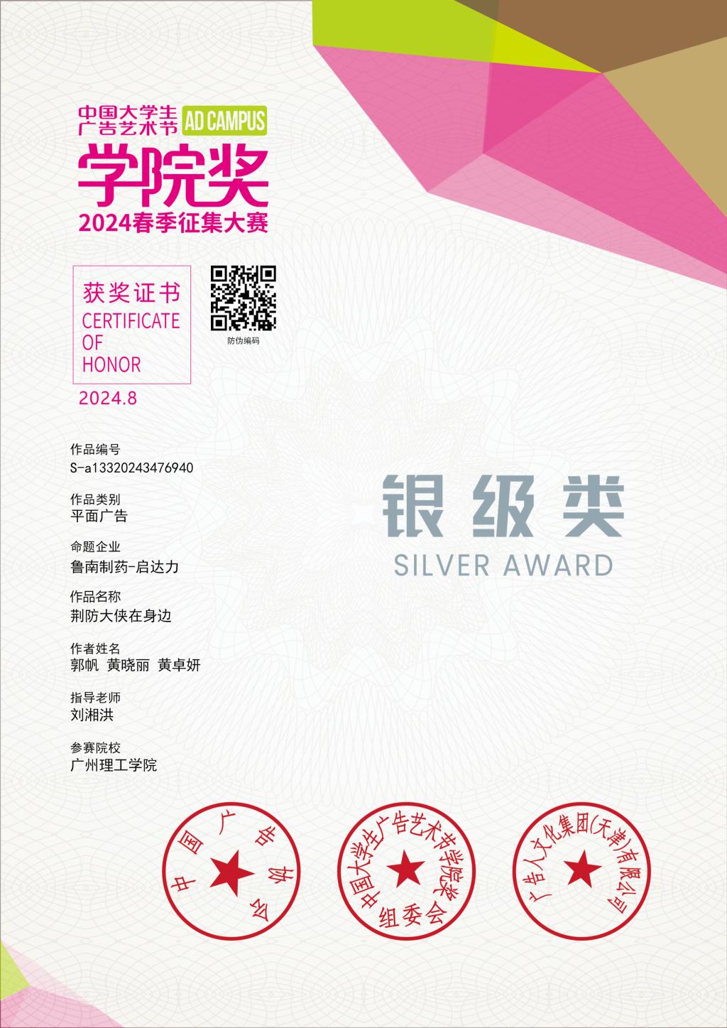 (刘湘洪 钟建军)8月24日,中国大学生广告艺术节学院奖(AD Campus) 2024 春季征集大赛青春盛典于北京广播大厦酒店圆满举行,学院共获得了2项 奖项,由刘湘洪老师指导的工业设计专业学生郭帆、黄晓丽、黄卓妍在命题 鲁南制药——启达力平面广告作品中荣获银奖。williamhill威廉希尔获奖学子荣幸被邀请到现场 参加颁奖典礼,由鲁南制药集团品牌总监郁杰先生现场揭晓,并颁发荣誉证书。