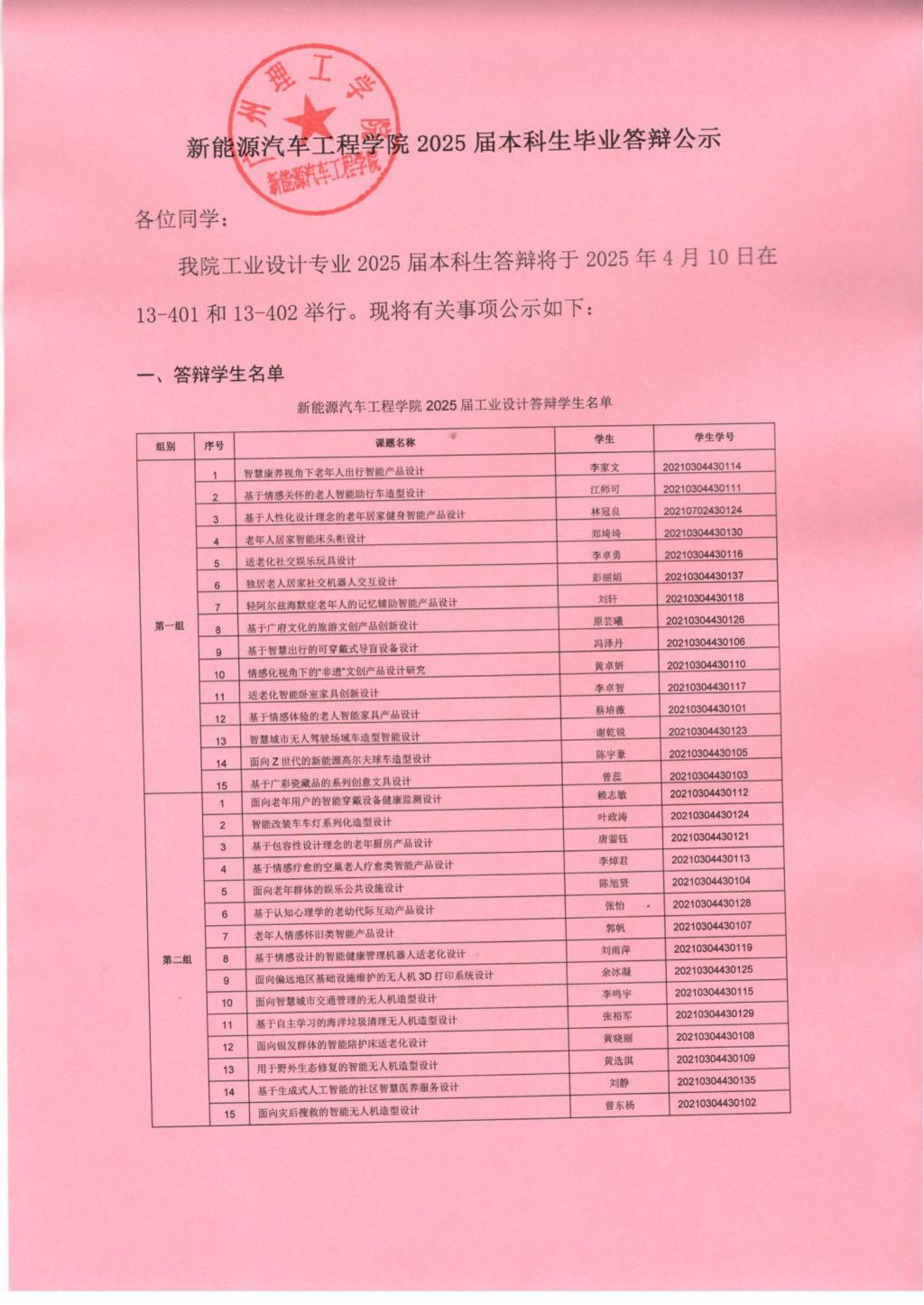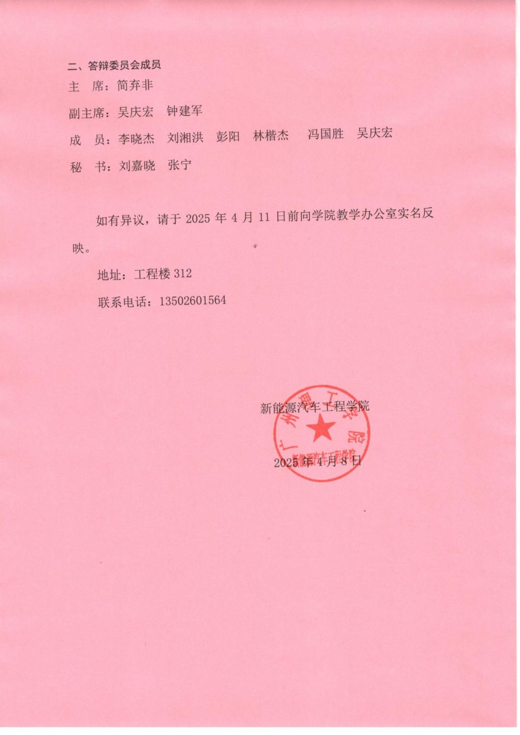 新能源汽车工程学院2025届本科生毕业答辩公示
