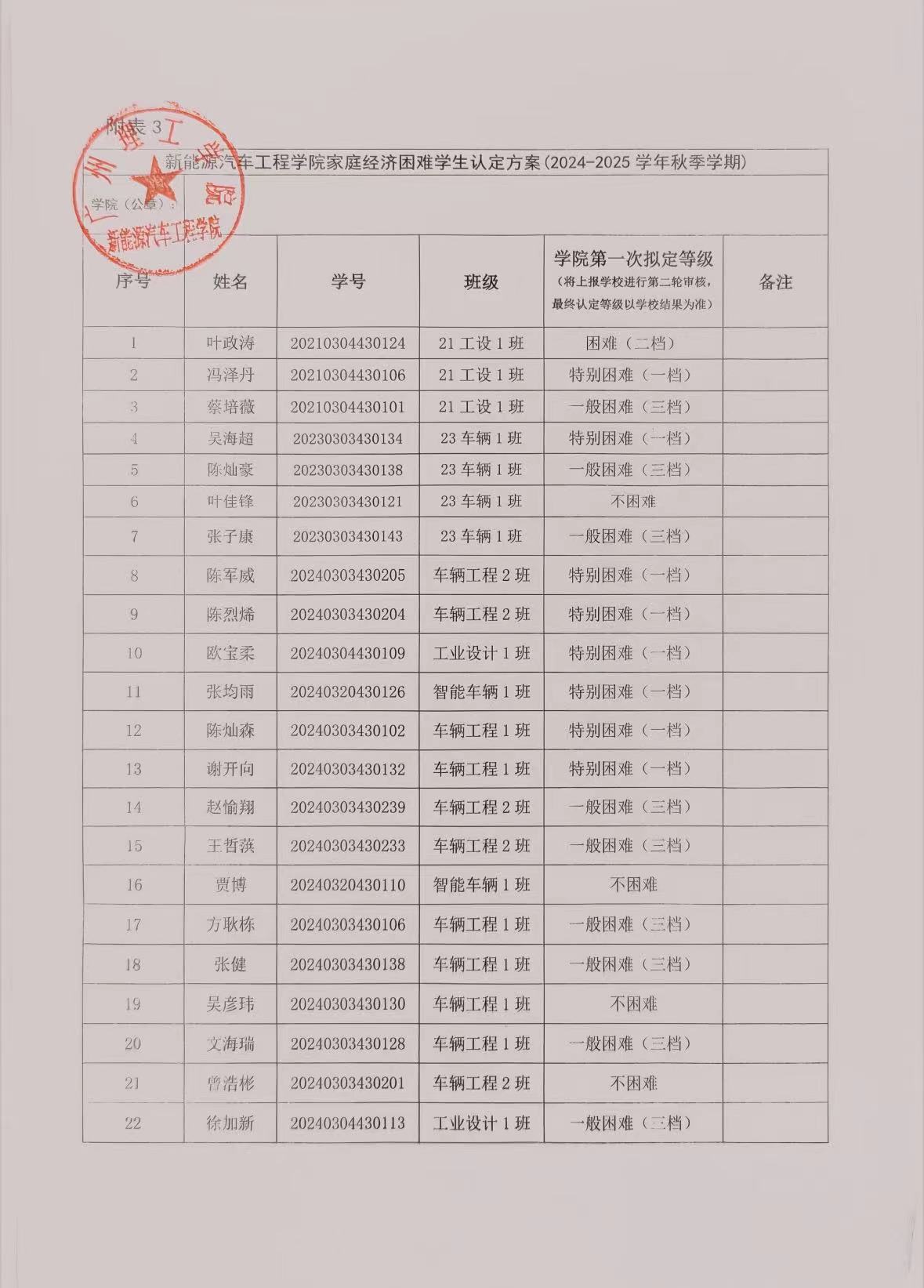 根据上级主管部门和williamhill威廉希尔相关文件的精神、按照公平、公正、公开的原则,经学生申请及班级、学院评审小组评议,现将广州理工学院新能源汽车学院2024-2025学年家庭经济困难学生认定等级初审结果予以公示,公示时间为2024年9月25至28日。若对公示内容有异议,请以书面形式向以下部门反映,反映情况时请签署真实姓名和联系电话,不签署真实姓名或不提供具体事实材料的,将不予受理。此名单中的贫困等级仅是初审结果,最终贫困等级结果以学校审核上报全国学生资助信息系统后由系统判定的贫困等级为准。